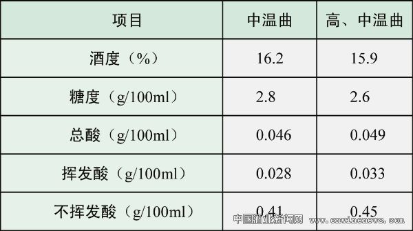 由于高、中溫曲混合使用做糖化發酵劑,黃酒的理化指標也發生了變化,其指標變化見表2。