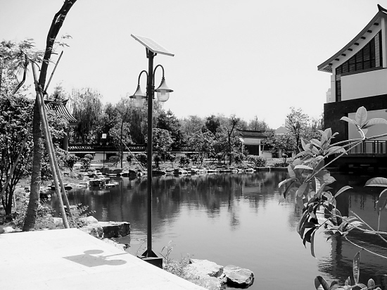 在獨具特色的烏篷船邊,你可以看到最新的LED(導體發光二極管)太陽能路燈,白天它依靠太陽能電池吸收能量,晚上天黑了自動發光。