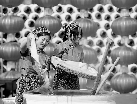 兩位釀酒女工正在做冬釀第一缸黃酒。從立冬到來年立春,是釀造黃酒的最佳時間,因而稱“冬釀”。 本報資料圖片