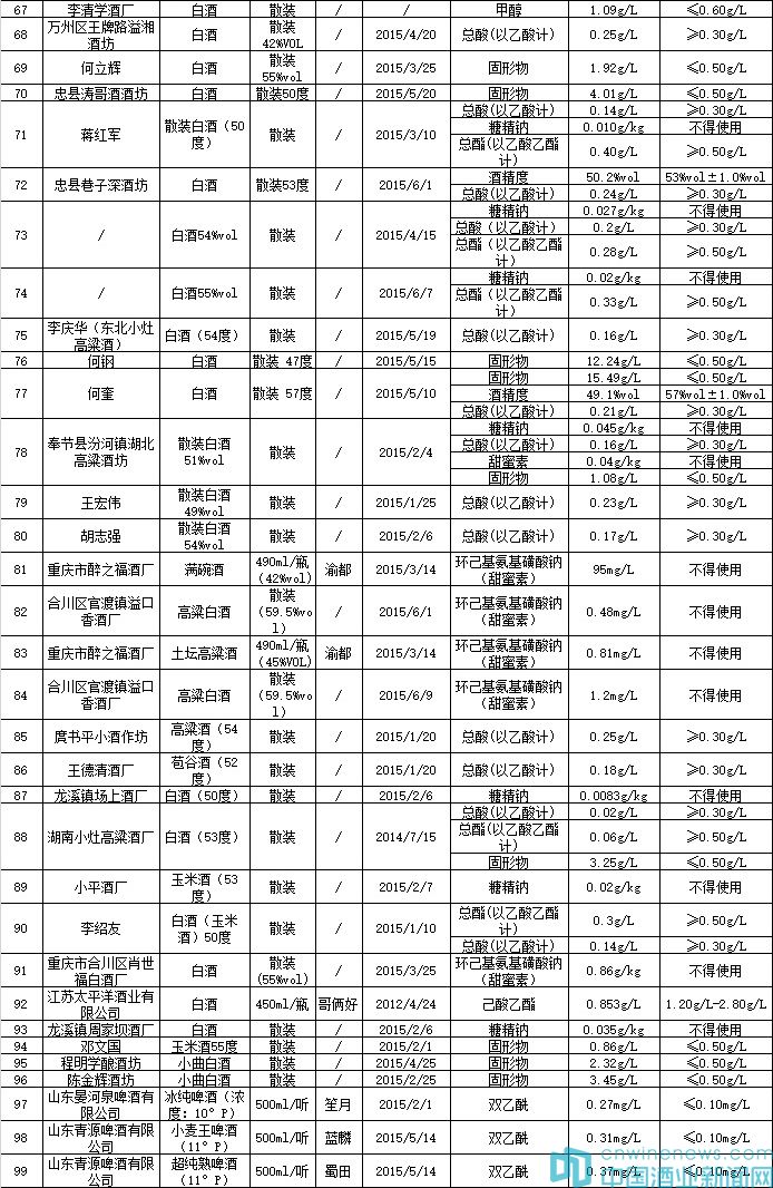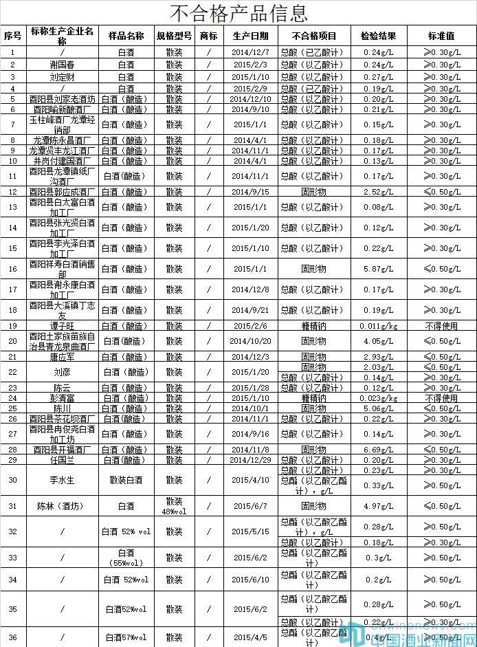本次抽檢的酒類包括白酒、白酒(液態)、白酒(原酒)、果酒(李子酒、楊梅酒、櫻桃酒等)、黃酒、葡萄酒、其他發酵酒、熟啤酒、生啤酒、鮮啤酒、特種啤酒、以蒸餾酒及食用酒精為酒基的配制酒。抽檢依據是《食品安全國家標準 蒸餾酒及其配制酒》(GB 2757-2012)、《食品安全國家標準 食品添加劑使用標準》(GB 2760-2014)、《食品安全國家標準 發酵酒及其配制酒》(GB 2758-2012)、《食品安全國家標準 食品添加劑使用標準》(GB 2760-2011)、《食品安全國家標準 食品中污染物限量》(GB 2762-2012)等標準、法規及產品明示標準和指標的要求。抽檢項目包括重金屬、其他污染物、食品添加劑及品質指標等20個指標。不合格產品如下: