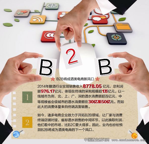 有觀點認為,酒類行業很可能是繼鋼鐵、化工、農產品后的又一個契機——市場體量大,2014年釀酒行業實現銷售收入8778.05億元,利潤總額976.17億元,體現在終端的采購規模超過1萬億元。據估計,這個萬億市場中,可能有半壁江山將成為酒業B2B的天下。