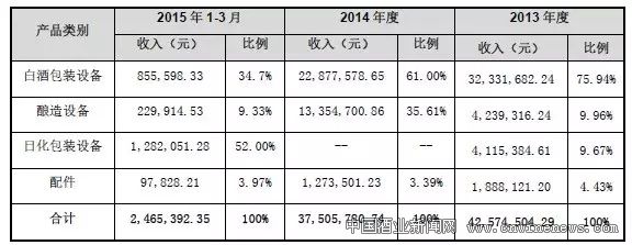 博雅智能表示,白酒包裝設(shè)備銷(xiāo)售為公司的主要收入來(lái)源;白酒釀造設(shè)備系公司2012年開(kāi)始研發(fā)、生產(chǎn)和銷(xiāo)售的新產(chǎn)品,在報(bào)告期內(nèi)收入不斷上升;日化包裝設(shè)備系公司新研發(fā)的產(chǎn)品,在申報(bào)期內(nèi)占比波動(dòng)較大,主要原因受宏觀經(jīng)濟(jì)形勢(shì)下行影響,公司客戶所在的白酒行業(yè)景氣度不高,公司開(kāi)始向日化包裝領(lǐng)域發(fā)展。