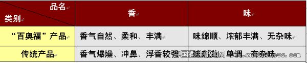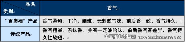 2.“百奧福”與傳統(tǒng)產品在香與味上的鑒別與對比(見表2)