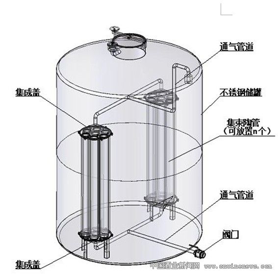 基于這些要求,我們研究了一種新型集束式陶管不銹鋼罐,其結(jié)構(gòu)如圖1所示。這種貯罐的特點就是罐主體采用不銹鋼制造,使罐具備不銹鋼罐的一切優(yōu)點,并在罐內(nèi)安裝集束式陶管或單根大直徑陶管,陶管兩端經(jīng)由通氣管道與外界大氣相連,每根陶管都相當(dāng)于一個小型陶罐,陶管內(nèi)部充滿空氣,外部直接與酒液接觸,與普通陶罐內(nèi)盛酒、外部接觸空氣正好相反,但集束式陶管表面積更大,與空氣和酒液接觸更充分,因此陶質(zhì)中金屬離子的催化作用,空隙系統(tǒng)的氧化和吸附作用更加徹底,白酒的老化速率和老熟效果可達到甚至超過一般陶罐。