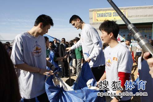 美國時間2月13日下午,全明星周末在鳳凰城正式拉開序幕,除了一些同籃球有關的活動外,NBA關懷活動是這些球員們最重要的社區活動之一。當天上午,在結束完全明星圓桌會議之后,24名全明星球員分兵三路,開展NBA關懷活動。在Cesar Chavez社區學校,不僅NBA總裁大衛·斯特恩、籃壇名宿保羅·皮爾斯、奧尼爾都親臨現場參加勞動。在現場,來自中國的三位年輕人,姚明、孫悅與“青啤男孩”武大偉默契組成的“三叉戟”,成為媒體關注的焦點。