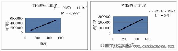 以濃度為橫坐標(biāo),峰面積為縱坐標(biāo),做酒石酸、蘋果酸的標(biāo)準(zhǔn)曲線,并計(jì)算出回歸方程(見圖1)。