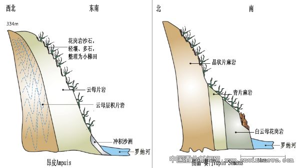 北羅納河谷葡萄園位于北部的維恩那到南部瓦朗斯之間,綿延70余公里文章來源華夏酒報,其中很多葡萄園位于陡峭的花崗巖碎石梯田上,其葡萄園海拔均為200米—300米之間,其中很多葡萄園背靠中央山地,面朝羅納河,坡度很陡峭,很多地方坡度達60°(見圖1),這使得生長在該地的葡萄獲得足夠的陽光。