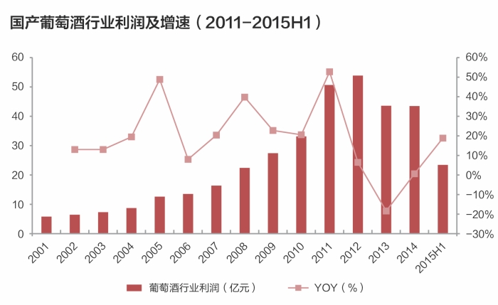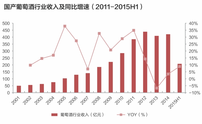 國產葡萄酒的發展同樣經歷了一個“黃金十年”。經歷近十年產量年均17%的高速增長后,2012年走至頂峰,行業收入自2001~2012年間年均復合增速達23%。隨著經濟增速放緩,“三公消費”限制加劇,2013年行業量價齊跌,同時產成品同比增速額和庫存壓力處于歷史高位,產量、行業收入和利潤均出現大幅下滑。不過,經過2014年的庫存消化,行業產成品存量增速逐步放緩,產量下降速度也開始減緩,收入和利潤出現回升。