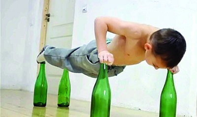 視頻中,國外5歲的小朋友Giuliano Stroe把雙手、雙腳小心翼翼地放到啤酒瓶上,一分鐘左右的時間,輕輕松松做了十幾個俯臥撐,在做俯臥撐的過程中,他全身懸空,四肢固定在四個啤酒瓶上,做完之后,小超人毫無壓力地秀了秀自己強壯的小身板,其中,八塊若隱若現(xiàn)的腹肌令人震撼。小超人眼神清澈、純潔,在視頻最后面對鏡頭眨了眨眼,微微一笑,瞬間秒殺眾多網(wǎng)友。