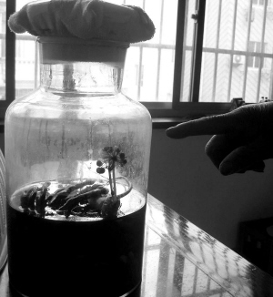 李大伯告訴記者,這瓶裝著各種名貴中藥材的酒,是親戚在9年前用高度白酒浸泡的。兩年前親戚把這瓶酒送給了他,當時也沒有發現有什么異常。他平常就放在家中的角落里偶爾喝一點,直到前天晚上,李大伯的兒子發現人參居然開花了。