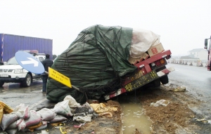 上午7時許,記者趕到現場時,該貨車還側翻在原地,車上滿載著白酒,左車輪陷入路邊泥土里。貨車駕駛員告訴記者,這車白酒是從湖北運往鹽城大豐的,行駛到該處時,由于在修路,出現了變道,下雨路面濕滑,拐彎時車輪陷入泥里,無法動彈,車身傾斜壓到高速公路的護欄上。所幸車上的防護網和繩子緊緊扣在一起,白酒沒有側翻到路面。