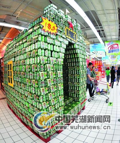 “超市的員工太寂寞了”、“有才啊,這個廣告效果真好。”29日,一位網友在蕪湖新聞網中江論壇上曬出了一張超市內景照片。貨架上,近千瓶罐裝的啤酒“組裝”成了一間綠色的“房子”(如圖),這間“啤酒房”有一個拱形的大門,兩側還有鑲著黃色塑料的“窗戶”,“門頭”上還鑲嵌著紅色的五角星及小紅旗。