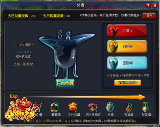 對酒當歌,人生幾何?夢工廠第三代頁游大作,首款職場穿越武俠頁游《小寶升職記》正在火熱測試中,游戲新推全新“兌酒”系統,讓玩家可以親手調制各類香醇美酒痛飲,快快呼朋喚友,來《小寶升職記》痛飲美酒,醉笑江湖吧!