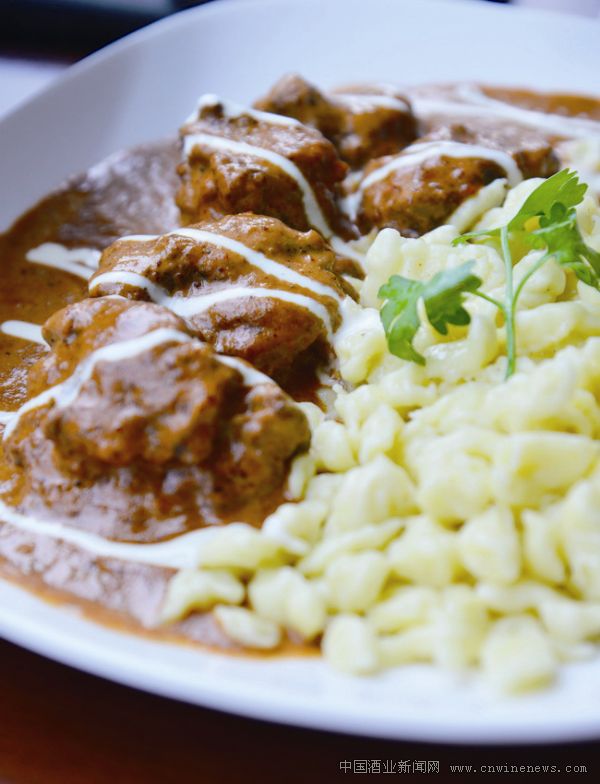 想點素食一款來減緩大肉之后的味覺。發現菜單上有款食物形似披薩,原來是德國傳統的弗拉登。弗拉登是用純麥芽磨粉做成餅底,鋪上腌橄欖、風干西紅柿、新鮮蘑菇和青節瓜,撒上莫澤里拉芝士,吃起來脆中有嚼勁,獨特健康。另一道古拉許(Goulash)則是傳統的奧地利食物,手工制作的牛油雞蛋面有著豐富的奶香和蛋香,配上傳統德式紅醬熬燉出的澳洲小牛腱肉,是非常質樸又美味的家庭料理。