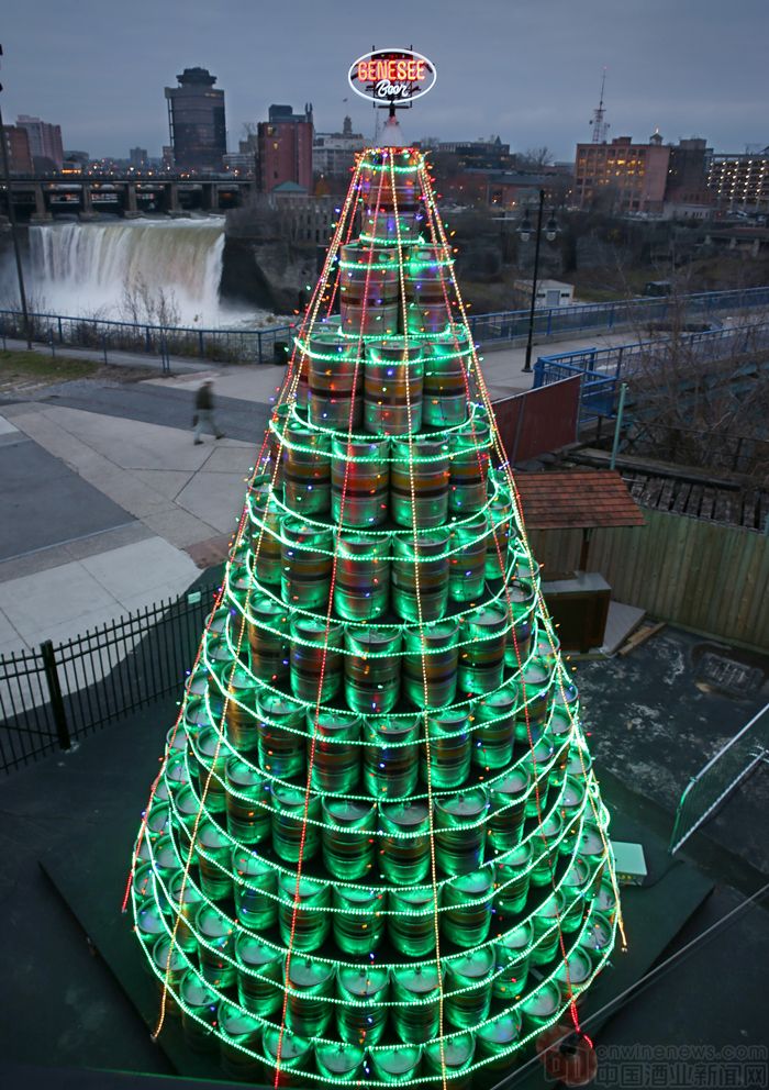 就在圣誕節前夕,在美國羅切斯特的杰納西啤酒廠外,用啤酒桶制成的圣誕樹被彩燈點亮。這棵圣誕樹由400個空啤酒桶制成,高26英尺(約8米)。新華社/美聯