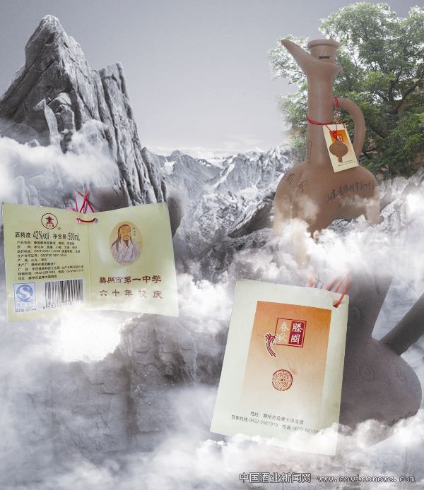 這次紀念酒所用酒瓶的紅陶鬶就是根據滕州出土的陶鬹造型而制,陶鬹酒瓶形狀如鳥,鼎足作鳥喙狀,方唇,斜直流較短,細長頸,把手外卷,分襠袋足,把手下的一袋足相對較肥大,姿態生動,極像伸頸而鳴的雁鳩形象,正引吭高文章來源華夏酒報歌,展翅欲飛,瓶體上散落分布著凹印“太陽紋”,酒瓶正面頸下部有凹印“至尊”二字,正面2個分襠袋足處分別凹刻“滕國”、“春秋”,在較肥大袋足一側凹刻三行字體,至上而下分別為:“山東省滕州市第一中學”、“60周年校慶”、“公元2010”, 瓶頸處有掛標,掛標正面印有濃香型白酒滕國春秋至尊酒字樣,內頁一側為滕伯像及滕州市第一中學六十周年校慶字樣,另一側則為注冊商標文公臺字樣,酒精度:42度 ,容量:500毫升,香型:濃香型,產品名稱:滕國春秋至尊酒,原料:凈化水、高粱、小麥、大麥、豌豆,執行標準:GB/T10781.1-2006,質量等級:優級,生產許可證號:QS3700 1501 3444,及產地,生產廠,生產日期,銷售熱線等等。由瓶上這些文字可以推知滕州一中于1950年建校,大家都知道滕州是墨子、魯班故鄉,是奚仲造車、孟子講學處;也是中外酒器文化理論創建人、中華酒器文化收藏泰斗李福民先生創建的首座中外酒(器)文化博物館所在地,可謂是桑梓教育,根深蒂固,傳統文化,源遠流長,處處顯示著物華天寶、人杰地靈。