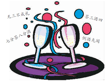 七分茶八分酒——就是指給客人沏茶只宜沏七分滿,而斟酒以斟八成為宜。還有另外一層意思是,暗示喝酒的人不可貪杯過量,這樣少斟節飲才既不會傷身體、出洋相,又不會造成浪費,這可謂古代斟酒中的“黃金分割法”。常言:“酒滿欺客”,現代,兩岸酒友在斟酒時更注重禮節與分寸,例如斟白蘭地酒時,只倒三分之一杯或更少些;紅葡萄酒倒至大半杯或更少。