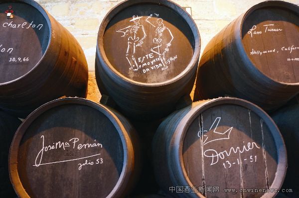 雪利酒產區所使用的三種主要葡萄品種Palomino、Pedro Ximenez、Moscatel釀成的非加烈酒的品質如何記者沒有發言權,因為到了赫雷斯喝的都是經過白蘭地加強過的雪利酒,其最精彩的部分當然是Solera索雷拉陳年系統。酒廠的許多桶非常古老,有上百年的歷史也并不稀罕,和釀造其他葡萄酒不同,這些古老的桶不會被更換遺棄,反倒是每一套Solera系統會給予不同雪利酒迥異的風格,所以往往是每一個獨立的酒窖中有獨立的一套層層疊起的酒桶,歷經歲月洗滌依然佇立。當然許多名人也會在酒桶上留下墨跡,形成永恒。