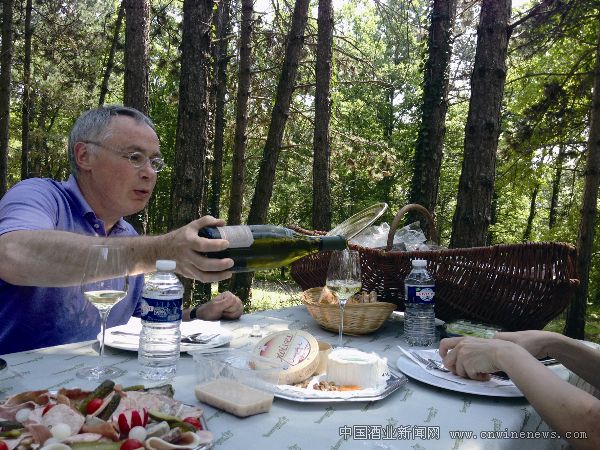 法國是浪漫之國,追求浪漫的生活方式,某日的上午,記者一行走訪了兩家酒莊之后,熱情的Blasons酒莊負責人Herve Tucki,又帶上各種便攜的美食,帶我們來到了能夠觀光大片葡萄園的山坡上,在陽光充足的樹蔭下,我們開始了我們的野餐:腌制的生肉片、火腿、各種奶酪、精美的甜點,當然總也不會忘記帶一瓶溫度正合適的夏布利葡萄酒。