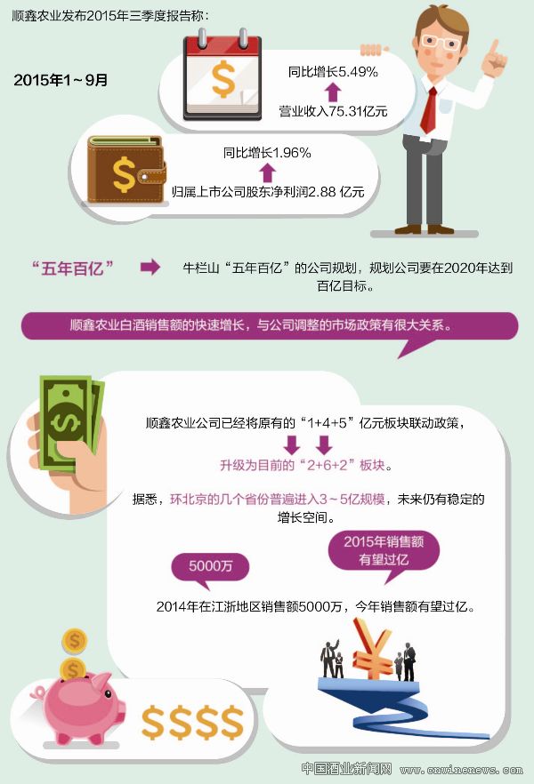 10月底,順鑫農(nóng)業(yè)(000860)發(fā)布2015年三季度報(bào)告稱,今年1~9月份公司實(shí)現(xiàn)營業(yè)收入75.31億元,同比增長5.49%,歸屬上市公司股東凈利潤2.88 億元,同比增長1.96%,實(shí)現(xiàn)每股收入0.54元。其中第三季度實(shí)現(xiàn)營業(yè)收入17.87億元,同比增長33.3%,歸屬上市股東凈利潤4056萬元,同比增長11.96%。