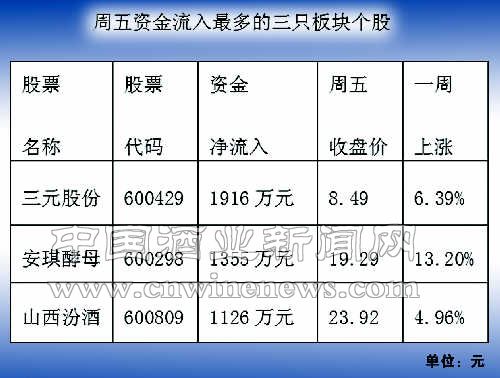 釀酒食品板塊一周主力資金凈流出約2.52億元。周五資金凈流出約4701萬(wàn)元。周五資金流入最多的三只板塊個(gè)股分別文章來(lái)源華夏酒報(bào)是:三元股份、安琪酵母 、山西汾酒 。