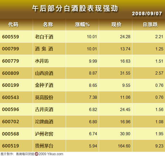 白酒股的上漲一定程度上也帶動(dòng)了其它酒類(lèi)股的上漲,葡萄酒、啤酒類(lèi)個(gè)股也小有上漲,而食品股也出現(xiàn)了積極向上態(tài)勢(shì)。