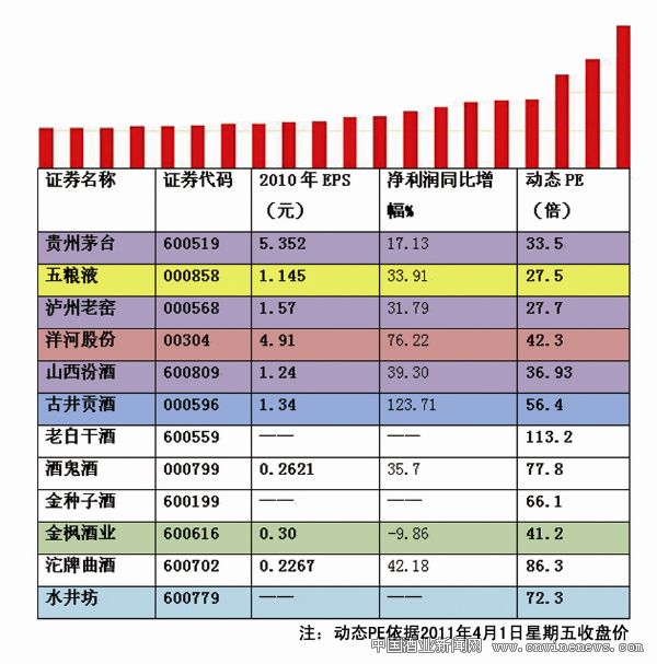 市場統計信息顯示:至2011年4月1日,白酒類主要上市公司除金種子酒、水井坊、老白干酒三家沒有公布業績外,其它白酒類上市公司均公布了年報。從年報數據來看,每股收益第一位的仍然是貴州茅臺,其2010年EPS(每股收益)為5.352元,第二位為洋河股份,為4.91元,第三位則為新秀古井貢酒。從已公布的白酒業上市公司年報總體情況來看,重點白酒類公司業績較好,11家白酒類公司中,每股收益超過1元的有6家,占比高達60%以上,體現了白酒行業在2010年的高景氣特征。