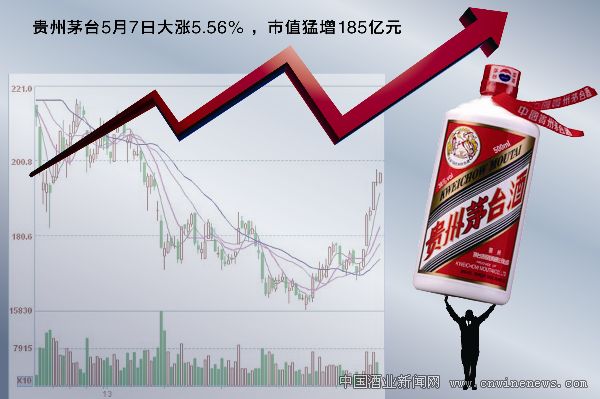 白酒龍頭股貴州茅臺曾5月7日大漲5.56% ,創出了近8個月來最大漲幅,市值猛增185億元。