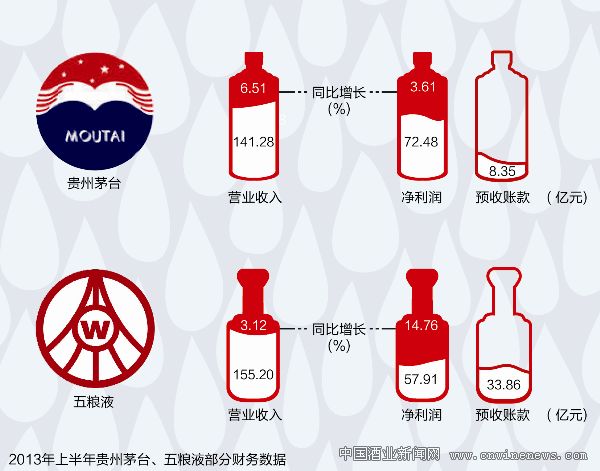文章來源華夏酒報; 8月中下旬,五糧液(000858)和貴州茅臺(600519)先后發布2013年中報。報告顯示,貴州茅臺今年上半年營業收入為141.28億元,比去年同期增長6.51%;凈利潤為72.48億元,同比增長3.61%。其中,凈利潤增幅為貴州茅臺自2001年上市以來的歷史新低,而營收增幅也只高于2003年非典時期,為上市以來第二低。