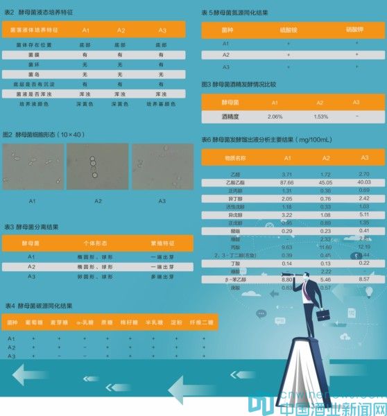 由表可見,酵母菌A1酒精合成能力最強,其次為酵母菌A2,而酵母菌A3的發酵液中沒有檢測到酒精。由此可見同樣是來自于酒醅中酵母菌,其對白酒產質量的影響是不同的,如何提高出酒率,提高優質品率,還需要對酒醅中的酵母風味物質代謝進行深入研究。