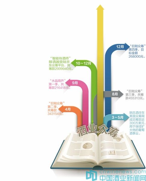 酒類眾籌在2015年進入“大躍進”模式。2015年,熱鬧的酒業個人眾籌產品“巨剛眾酒”進行到了第四季,在其第一季項目中,“巨剛眾酒”提出做中國最好的手工釀制陳年紹興黃酒,選用中糧紹興酒業手工釀制的原壇儲藏12年以上花雕酒,搭配哥窯瓷瓶,售價99元/瓶,共限量1000瓶。參與者可根據眾籌額度不同,獲得相應的產品與活動回報,推出后不到24小時即完成目標,最終籌款達成預訂目標的182%。