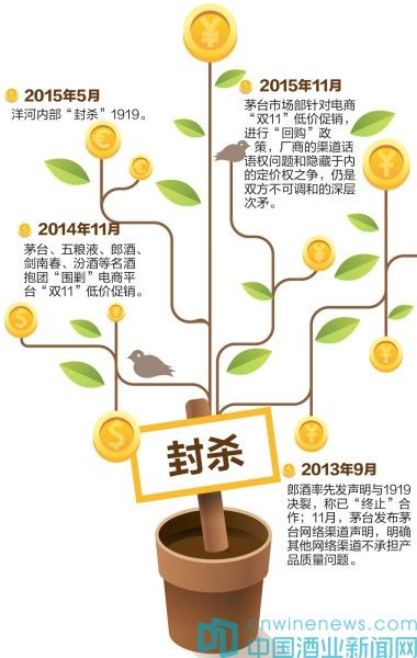 對1919而言,這已經不是第一次遭遇封殺,作為新興酒類銷售平臺的1919酒類直供,早在2013年就曾與郎酒發生過類似博弈,雙方沖突的原因是,1919酒類直供以遠低于市場的價格銷售郎酒產品。而來自價格上的沖突已經成為電商平臺和酒企之間最大的矛盾,2014年“雙11”,一些電商平臺與幾大酒企之間爆發了最大的沖突,火藥味十足。