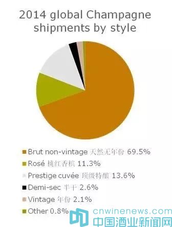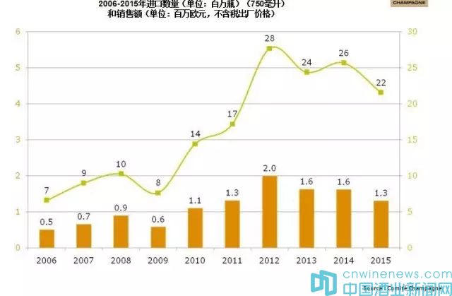 ——2015年,香檳占到整個氣泡酒銷售量的13%,而金額占到了高達40%,說明香檳在氣泡酒中是價值最高的。這些數(shù)據(jù)說明了香檳具有非常大的市場價值。