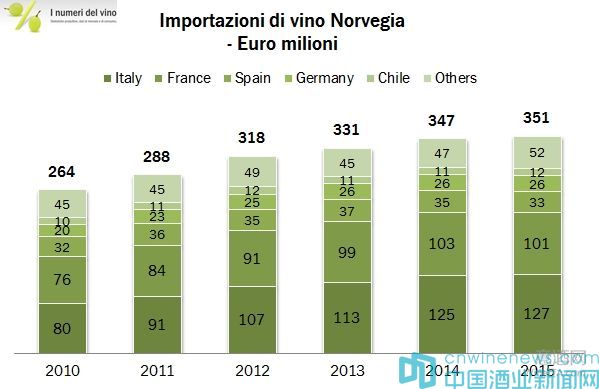 意大利Wine Monitor葡萄酒監測機構發布的最新數據,挪威是位列中國之后的意大利葡萄酒第六大市場,2015年意大利葡萄酒在挪威市場實現了1.27億歐元的銷售額。