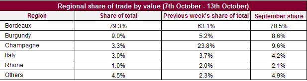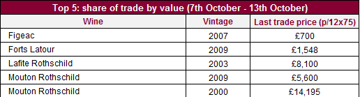 波爾多的交易價值表現特別強勁,占交易額79.3%。一級酒莊尤其活躍,占了交易額27.5%。木桐Mouton Rothschild 2000年(WA96+)和2009年(WA99),及拉菲Lafite Rothschild 2003年(WA100)同在五大最高交易額葡萄酒榜上有名。