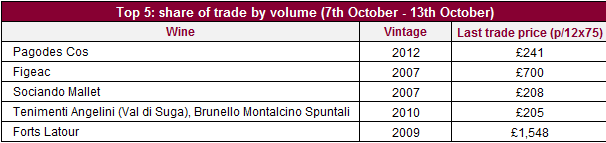 副牌葡萄酒這周再次活躍。小拉圖Forts Latour 2009年(WA94)上榜五大最高交易額的葡萄酒之一;愛士圖爾副牌Pagodes Cos 2012年(WA88)則成為這周最高交易量的葡萄酒。