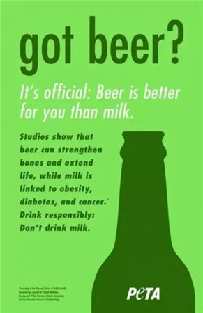 不過,PETA在官網(wǎng)上解釋說,“Got Beer?”其實不是鼓勵喝啤酒,而是建議大家寧愿喝果汁、豆奶、礦泉水、甚至汽水,也不要喝牛奶了。