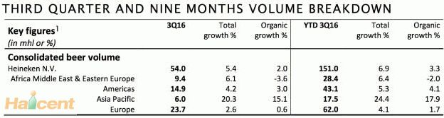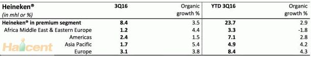 今年第三季度,旗艦品牌喜力啤酒在高端細分市場有機增長3.5%,前三個季度共有機增長2.9%。其中,中國、南非和巴西市場表現強勁,美國、希臘、越南和俄羅斯市場稍顯疲態。