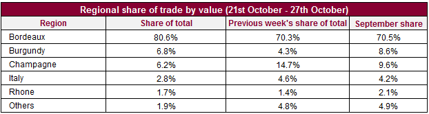 然而,上周一級酒莊的交易份額卻有所下跌,只有14.2%。當中最活躍的是拉菲Lafite Rothschild,占了一級酒莊29%的份額。而“出色的”波爾多年份的表現最佳,以2009年份最為熱賣,其次是2010和2005年份。