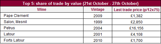 克萊蒙教皇Pape Clement(WA 95)上周同時成為最高交易價值和數量的葡萄酒,其成交價更創下歷史新高,每箱12×75為1,382英鎊。在4月出版的Hedonist's Gazette 中,此酒取得帕克Parker完美100滿分。自此,便出現了一股熱賣風潮,而它的價格也不斷上漲。