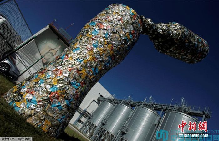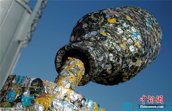 當地時間2016年10月31日,黑山尼科希奇,藝術家Marko Petrovic Njegos在Trebjesa啤酒廠建立一座5米高的雕塑。雕塑由空啤酒罐組成,展現酒瓶與酒杯。
