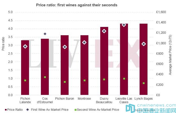 然而,愛士圖爾Cos d'Estournel和碧尚女爵Pichon Lalande的副牌價格相對其主牌卻較為昂貴,它們之間的價格比率分別為3.4和3.3。在副牌葡萄酒中,小愛士圖爾Padogas Cos的平均市場價格最高,每箱12×75為350英鎊。