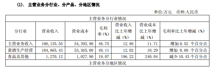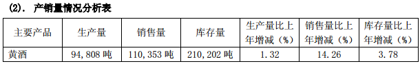 作為營(yíng)收占比達(dá)到98.8%的主營(yíng)業(yè)務(wù),金楓酒業(yè)旗下黃酒業(yè)務(wù)實(shí)現(xiàn)營(yíng)收10.49億元,同比增長(zhǎng)12.02%。黃酒產(chǎn)量完成9.48萬(wàn)千升,銷售量達(dá)到11.04萬(wàn)千升,庫(kù)存量達(dá)到21.02萬(wàn)千升,上述三個(gè)指標(biāo)分別同比增長(zhǎng)1.32%、14.26%和3.78%。