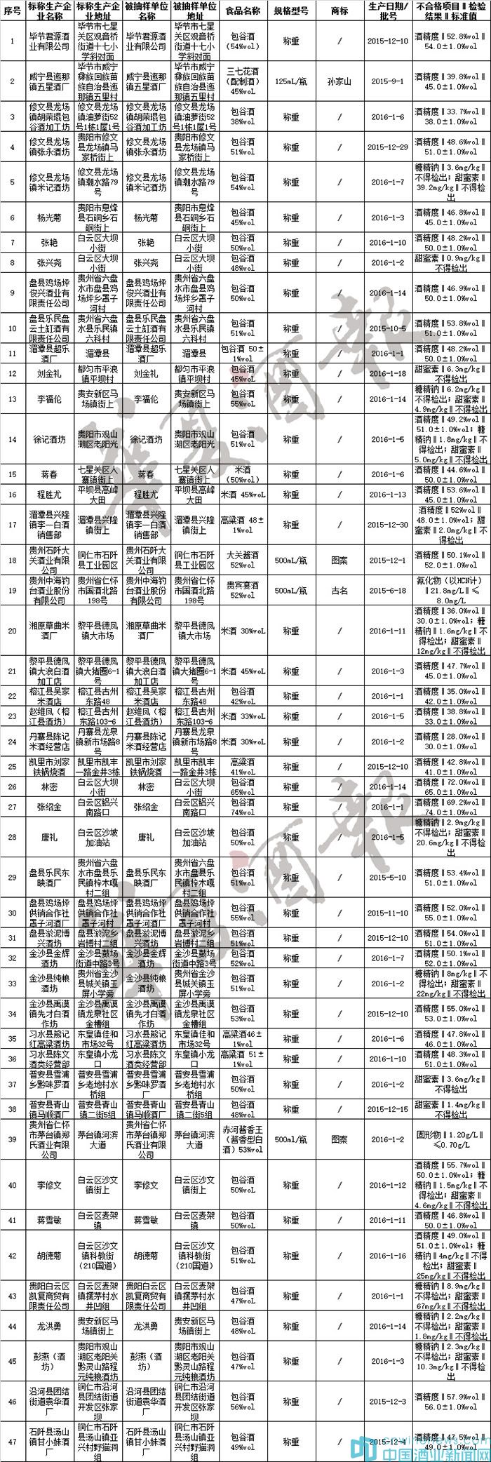 標稱楊光菊生產(chǎn)的包谷酒45%vol、盤縣樂民盤云土缸酒有限責(zé)任公司生產(chǎn)的包谷酒51%vol、程勝尤生產(chǎn)的米酒45%voL、黎平縣德鳳鎮(zhèn)大浪白酒加工店生產(chǎn)的米酒45%voL、趙維鳳(榕江縣酒坊)生產(chǎn)的米酒33%voL、凱里市劉家鐵鍋燒酒生產(chǎn)的高粱酒41%voL、林密生產(chǎn)的包谷酒65%vol、盤縣樂民東映酒廠生產(chǎn)的包谷酒51%vol、盤縣淤泥博興酒坊生產(chǎn)的包谷酒51%vol、金沙縣禹謨鎮(zhèn)先才白酒作坊生產(chǎn)的包谷酒53%vol、習(xí)水縣熊記紅高粱酒坊生產(chǎn)的高粱酒46±1%vol、沿河縣團結(jié)街道袁華酒廠生產(chǎn)的包谷酒56%vol檢出酒精度超標;
