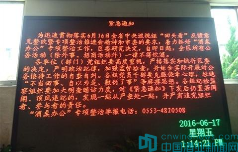 此外,安徽淮南壽縣縣委辦公室也在6月17日發布通知稱,為認真貫徹中央巡視組巡視“回頭看”反饋意見整改暨專項整治推進電視電話會會議精神,根據市委統一部署,按照有關規定,在全市范圍內開展“酒桌辦公”專項整治工作。