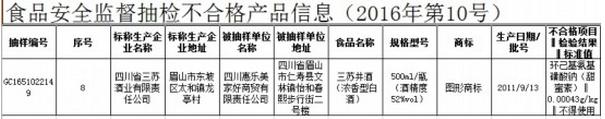 數據顯示,所抽檢的三蘇井酒所標注的廠址為眉山市東坡區太和鎮龍亭村,規格為500ml/瓶(酒精度52%vol),生產日期為2011年9月13日,不合格原因是含有不得檢出的項目——甜蜜素而不得使用。