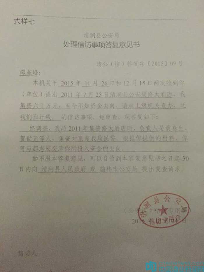 當年12月24日,清澗縣公安局給邵東峰出具了一紙“處理信訪事項答復意見書”。該意見書認可了該局于2011年向民警集資修建酒店。但對邵東峰提出的集資款去向,意見書稱“你可與郝志鴻交涉你所投入資金的去向”。