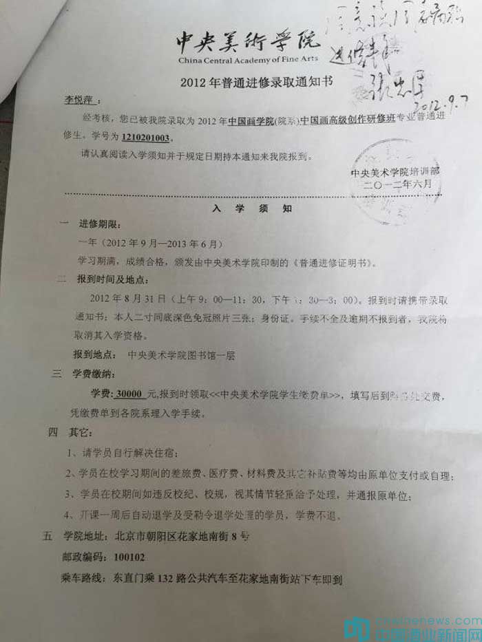 其中,一紙中央美術學院錄取通知書顯示,李悅萍在2012年6月被錄取為“2012年中國畫學院中國畫高級創作研修班”專業普通進修生,進修期一年(2012年9月—2013年6月)。