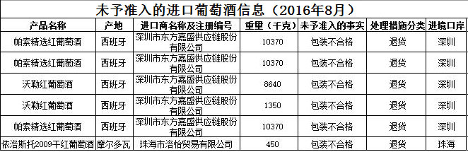 從發布的表格來看有6批次進口葡萄酒因包裝不合格被海關退貨,這6批次的葡萄酒分別為西班牙帕索精選紅葡萄酒、沃勒紅葡萄酒和摩爾多瓦依洛斯托2009干紅葡萄酒