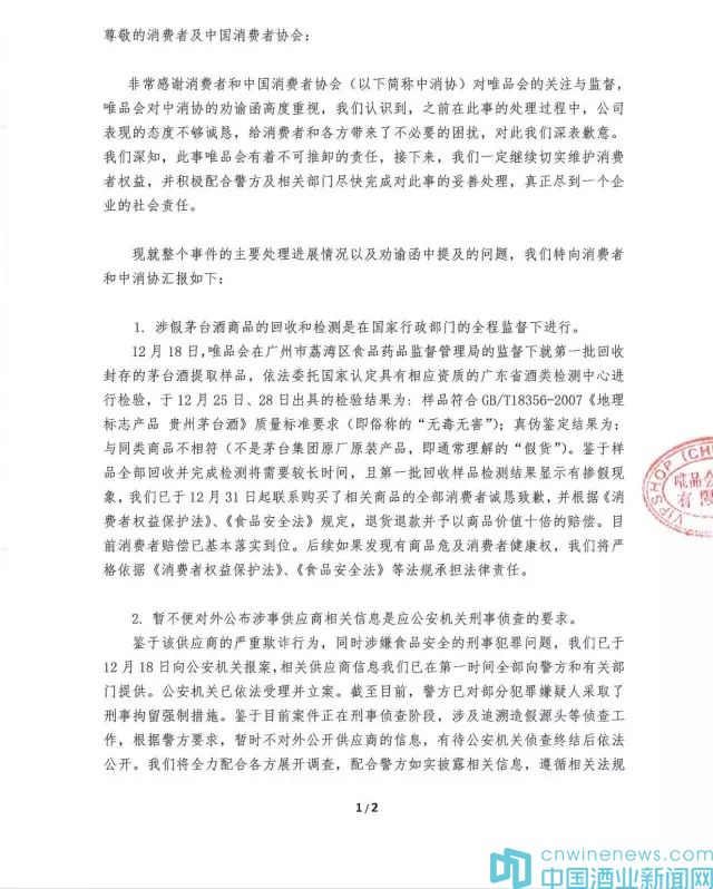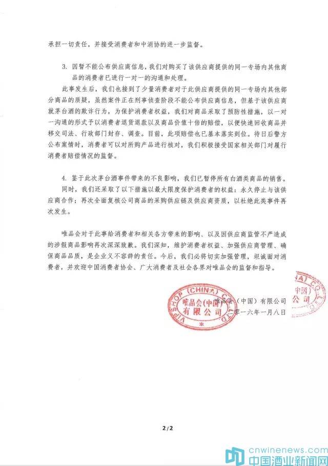 鑒于茅臺酒事件帶來的不良影響,唯品會已暫停所有白酒類商品的銷售,并永久停止與涉事供應商的合作,再次全面復核公司商品采購供應鏈及供應商資質,杜絕此類事件再次發生。致歉函全文如下: